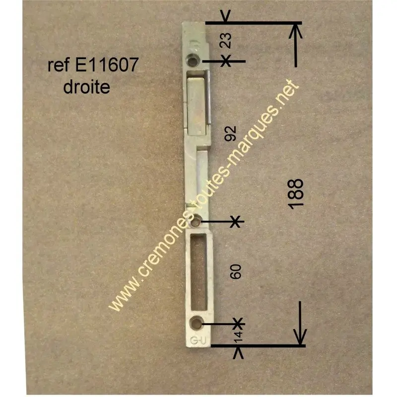 Conseil d'expert : Avant l'achat, vérifiez bien que le code E11607 est gravé sur votre pièce actuelle, car les gâches se ressemblent beaucoup mais varient de quelques millimètres selon le profil de votre fenêtre.