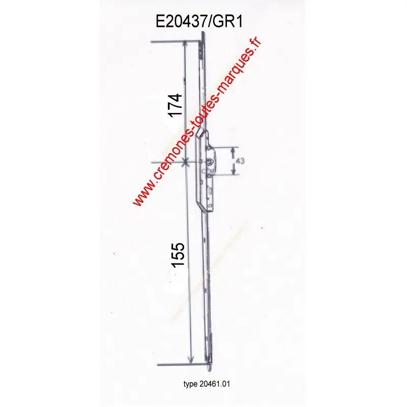 Type : Crémone à larder (s'encastre dans le chant de l'ouvrant)